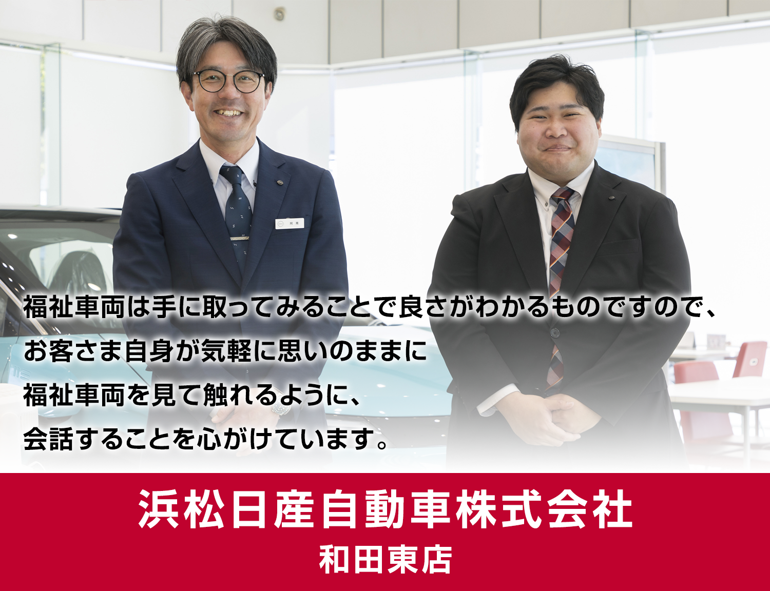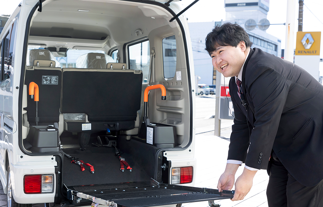 相羽さん:福祉車両のご案内はもちろんですが、日常的な会話など私たちと話すことが楽しいと思ってもらえるような接客を心がけています。福祉車両に対して「こうなったらいいな」という思いなど、些細なことでも気兼ねなくご相談ください。